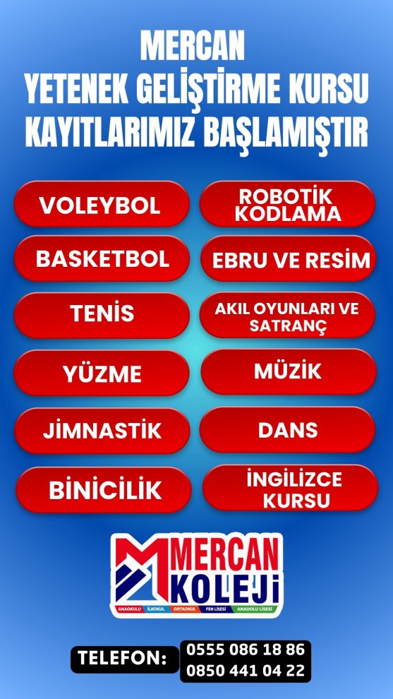 Voleybol, Basketbol , Futbol, Tenis, Yüzme, At Binme, Jimnastik, Robotik Kodlama, Ebru ve Resim, Akıl Oyunları ve Satranç, Müzik, Dans, Kur Programlı İngilizce, Çocuk İngilizcesi Mercan Yetenek Geliştirme Kursları Kayıtlar ve Kontenjan için 0555 086 1886, 0850 441 0 422